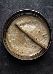Rotli (a Gujarāti word), also known in other Indian languages as roti, chapāti, and phulkā, is probably the most widely made Indian flatbread. It begins with whole wheat flour (see Note 1). Rotli are characteristically thin, soft, and pliable so that they may be used to scoop up vegetable dishes such as Rasāvāla Baby Potatoes and Flāvar Vatānā Nu Shāk. This is a daily bread, best ma