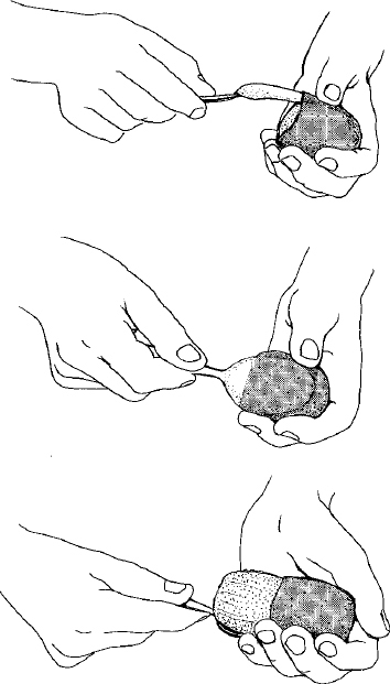 - Peel the kiwis (see Figures 7-6). Cut in half lengthwise and remove the small hard section at the bottom. Place the fruit in a food processor, add