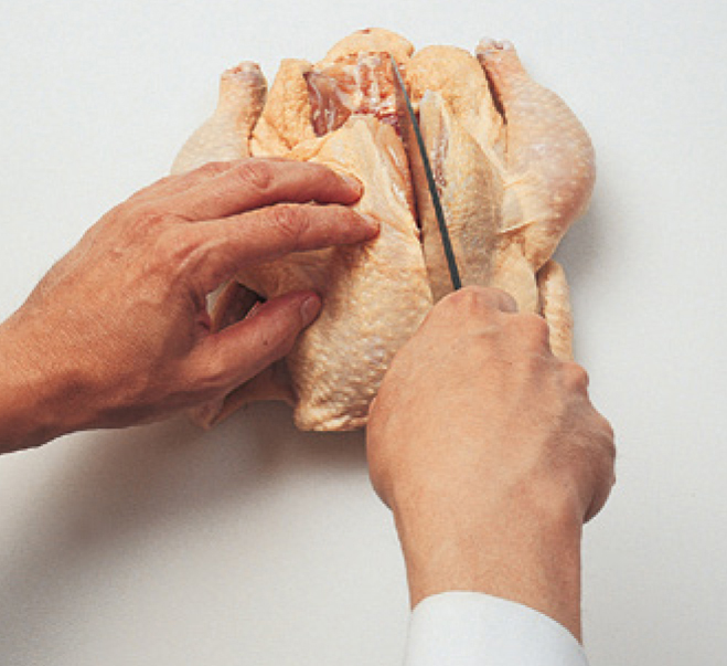 Cut the chickens into 8 pieces as shown in