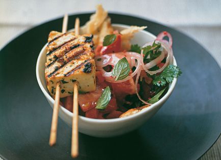 The inspiration for this light main course dish is based on a similar bread salad from Tuscany, called panzanella. I experimented on the idea of adding some Asian flavours on the same theme, and replaced the more usual bread for naan bread. The result was deemed worthy of inclusion, so here it is. These little kebabs taste even better if cooked on a charcoal grill. Indian paneer cheese is similar to Asian tofu in that it has a bland flavour in itself, but often absorbs the flavours of other