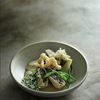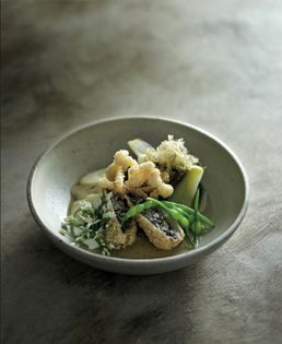 This is a fun and very textural vegetarian dish. Bamboo fungus is a type of mushroom that is grown in the bamboo forests of China. It is sold dried and is available at good Chinese grocery stores. The mushroom is hollow and a perfect vehicle for stuffing — I fill the mushroom with tofu and black sesame seeds but you could use different combinations. This dish is served with wonderful small kamo eggplants, which have very few seeds and a lovely flavour. I like to steam the eggplants before r