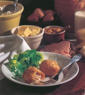 Traditionally a gougère is a round or ring-shaped cheese choux pastry. This variation uses plain choux pastry and a sprinkling of cheese to make small puffs that are then filled with a creamy smoked-ham and cheese sauce.