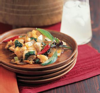 This is my husband Will’s favorite Thai dish, perhaps because he encountered it in a small cafe overlooking the Kwae River during his first journey to Thailand. Restaurant cooks make it with minced chicken, beef, or pork, hand-chopping the meat with a heavy cleaver just before cooking. Chopping the meat provides maximum surface area to absorb the spectacular combination of hot green chilies, garlic, and holy basil (bai graprao), a pungent, peppery herb. Try this using ground meat from the g
