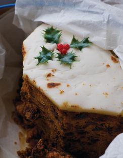 My family tends to have a Dundee cake as our Christmas cake, but here’s the more usual item. This dark and elaborate fruitcake is supposed to be made weeks before the holiday and “fed” brandy or whiskey every week. If you can keep up with the demands of feeding a cake, you’re rewarded with complex flavors like a fine, aged wine. It’s meant to be finished off with a layer of marzipan, then sealed with a glossy finish of hard royal icing, and, in the days af