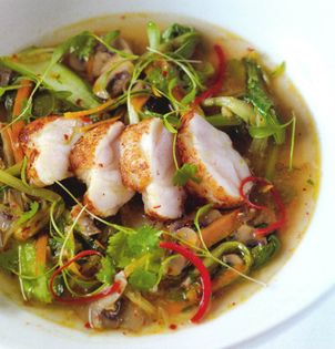 Cover with hot water, add the soy and fish sauce and allow to simmer while you cook the monk fish.