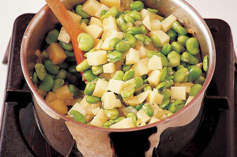 Habas are fresh broad beans, and are a great deal nicer than the dried variety, known as favas. The word has vanished from the Spanish dictionary and the rather indigestible dried bean has all but disappeared as well. This fresh soup uses a modern herb too – coriander is not a common Spanish ingredient, but it adds a delicious flavour.