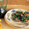 Raisins and pine nuts are frequent partners in Spanish recipes, as the pine nuts are astringent yet rich, the raisins sweet. Here, tossed with wilted spinach and croûtons, they make a delicious snack or main meal accompaniment.