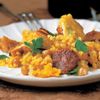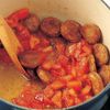 Preheat the oven to 190°C/375°F/Gas 5. Heat the oil in a flameproof casserole and fry the sausage until browned. Add the tomatoes and fry until reduced. Stir in the pork and chicken or rabbit pieces and