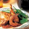 Chicken with prawns is another gorgeous Catalan dish. The sauce is thickened with a picada of ground toasted almonds, which is more convenient than making a roux with butter and flour at the last moment. This special Picada traditionally includes crumbled butter biscuits, which were considered more sophisticated than the bread that normally goes into Picada. The sauce is finished with cream and cayenne, as a modern touch - a splendid dinner-party dish. Serve with a glass of Torres Gran Viña