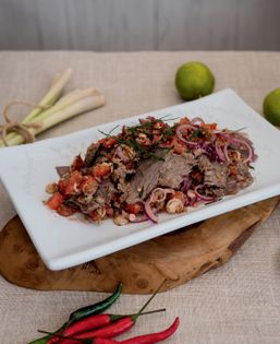 The Malay word kerabu can be loosely translated as salad. It is a dish where fruits, vegetables and, oftentimes, grilled meats, are mixed with lots of different herbs and spices. The tangy sauce is best drizzled over the dish at the last minute before eating. There are many variations of kerabu. It is a dish enjoyed by many as it can be eaten on its own, with rice or as a side dish. This is my version of kerabu and you are free to add other vegetables such as cucumber o