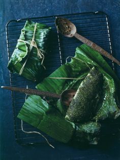 A traditional Parsi dish, this is so delicious and everyone loves it, with the vibrant green herbs and sweet coconut. The Parsis were persecuted in Iran during the 10th century and fled to India, bringing their style of cooking with them. This dish has a beautiful tangy taste which comes alive when it is steamed in its parcel in the oven. You can use any type of white fish. It is steam-baked so keeps lovely and moist. Banana leaves are widely available in Thai and Indian grocers and they im
