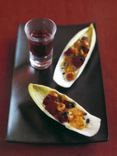 The leaves of chicory (also called whitlo of or witloof), like those of Baby Little Gem, were made to be canapé vessels, as they have a natural hollow. You may like to make a platter up using alternating red and green chicory for a lovely effect.
