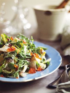 Knobbly Jerusalem artichoke tubers look a lot like root ginger. They have a thin skin, crisp texture when eaten raw and are soft when cooked; I especially love them roasted. They make a delicious soup and marry so well with seared scallops [see Warm Seared Scallop, Jerusalem Artichoke & Fresh Herb Salad] but are somewhat indigestible and can cause flatulence. This salad is adapted from a starter dish I served when I owned Claude’s Restaurant in Sydney.