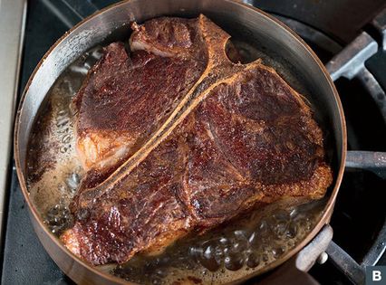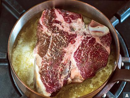 Here is an example of a sauce made by first sautéing meat—any steak cut will work for this—and then deglazing the pan with shallots (which are allowed to toast a few seconds) and red wine. Glace de viande is added and the sauce finished with parsley.