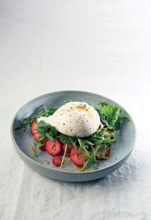 This is pretty much my perfect summer salad. Burrata, a type of mozzarella, has soft creamy curds in the middle, which is why it is not cut up before it goes into the salad. Freshly ground black pepper and sweet strawberries is one of those surprising culinary relationships that become a happy revelation when first tasted.