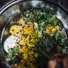 In a large bowl, combine the eggs, crème fraîche, onion, scallions, garlic, cilantro, garam masala, salt, pepper, turmeric, and chili flakes and beat with a whisk or fork; do not overbeat.