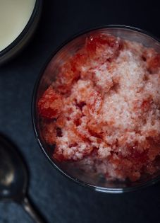 Watermelons are a delightful fruit, which I think Mother Nature created to help us get through the hot months of summer. The bold color and flaky texture of this watermelon granita get a flavorful lift from condensed coconut milk and the floral scent of elderflowers. Condensed coconut milk can be found at most grocery stores and Asian markets.