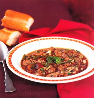 From Sefarad Yemekleri comes this deliciously lively “Georgian-style” soup served in Turkey. Greengage plums add both sweetness and tartness to the combination of herb-scented beef, onion, and rice. Keeping with Turkish Sephardic tradition, lemon juice is added for additional tartness. If you don’t have leftover stewing beef, you can braise some cubed beef chuck or brisket in water or stock for about an hour and add it and the cooking liquid to the soup. And if you cannot find Greeng