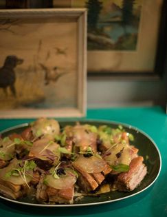 I have an abiding fascination for cathedrals and ecclesiastical objects – candlesticks, altar rails, prayer stools and frescoes. I’m also drawn to hagiography (biographies of saints) even though I did not grow up remotely Catholic. So, for me, stained glass windows are right up there with any of my other favourite objects of colour and light. This is how (and I know it’s a push!) these translucent stewed apples came to be named. They are used to dress a truly heavenly pork belly.