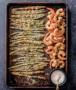 A hot oven is imperative to ensure that these fries emerge golden and crisp but the shrimp don’t overcook. If asparagus is not in season, make the fries with zucchini, squash, or mushrooms. If you can’t find Meyer lemons, substitute any citrus.