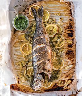 Just a few ingredients—fish, white wine, and some aromatics—make an impressive yet easy dinner. Be sure to show off the whole roasted fish to your dinner companions before filleting it. Chimichurri is an Argentinean herb sauce that is best prepared just before serving so it will retain its vibrant green color.