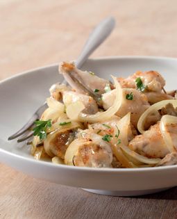 Dust the frogs’ legs with flour and shake them well to remove any excess. Heat the butter in a pan until it sizzles and put the frogs’ legs in. Sauté them over high heat until they brown slightly. Season with fine table salt and freshly ground pepper, and add the softened onions. Transfer to a serving platter.