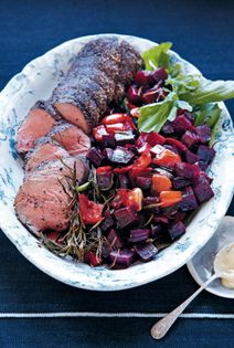 The surface of the beef is covered in pepper and then left in the fridge to form a dry crust, which magically means it doesn’t need to be seared, just cooked in a very hot oven. The timings are quite precise, so I always write