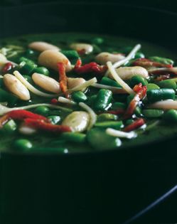 This is a spring minestrone bursting with vibrant colours and flavours. It has to be cooked then served immediately, otherwise you will lose the vivid green colour. If you’re making this for family, friends, or a dinner party, have the cannellini beans cooked and ready, the pesto made and vegetables prepared. Then it’s just a simple matter of cooking the vegetables and adding the pesto at the last minute.