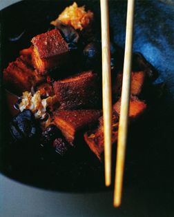 In this recipe, the pork is fried first, to crisp and cook it, before being braised with crunchy fungi, meaty mushrooms and rich, intensely flavoured dates. (The dried fungi and red dates are available in Asian food stores.) This ‘double cooking’ gives the dish a dist