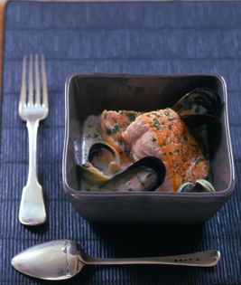 Clams, cockles, or mussels can all be steamed open to provide a base for a savory broth you can use to surround sautéed, baked, poached, or grilled salmon fillets. Because the sauce should be made at the last minute, I sometimes bake the salmon fillets instead of sautéing them so I can fuss with the sauce while the salmon is cooking.