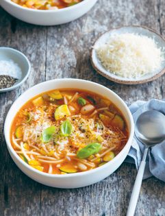 This hearty soup is a great way to introduce kids to vegetables like celery, which softens and mellows with slow cooking. To make this vegan, leave out the parmesan and top with toasted pepitas and sunflower seeds instead.