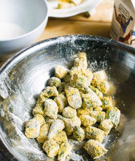 In a medium bowl, combine the flour, cornmeal, salt, and cayenne. Toss the okra in the buttermilk, drain, then toss in the flour mixture to coat, then spread on a waxed paper–lined tray and put in the freezer. Set a plate lined with paper towels near the stovetop and pour about