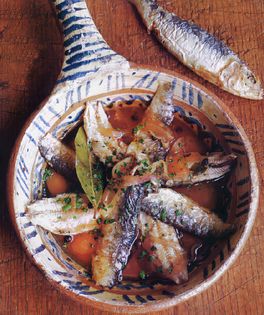 You’ll find pickled fish (sardines, mackerel, tuna, and, in summer, various “blue” fish) all around the Mediterranean. This recipe, pleasantly pungent with some dried hot pepper and white wine vinegar, is based on a pied-noir (French Colonial) dish I ate in Oran in the early 1970s, similar to recipes prepared in southern France and Spain. All are based on simmering whole fish in a strong medium, then boning and leaving them to marinate in the same liquid. A lengthy pickling gives bes