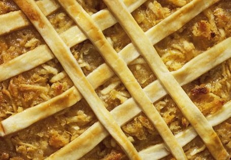 Adding the coarsely grated Bramley apple and the zest of 2 lemons stops the toothaching sweetness that is almost too much to bear. You may add a large handful of walnuts too if you want more crunch. If you don’t have enough end bits of pastry to lattice the top it really doesn’t matter. A classic.