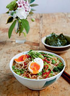 Cook the ramen noodles according to the packet instructions, adding the frozen peas (or whichever veg you opt for) to the pan so they cook at the same time. Cook the egg by poaching it in the broth (whisk it in a bowl first then pour it into the broth or crack it in), boiling it whole in a separate pan, or giving it a quick fry.