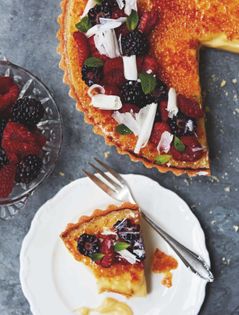This dessert really does have the wow factor. Softly cooked, creamy custard encased in a crisp pastry case (shell) with the added caramel crunch of the brûléed top. Crème brûlée is my absolute favourite dessert, and serving it in a tart and enriching it further with white chocolate only adds to its splendour. I love the way you can slice the tart at the table – the satisfying crunch when the top cracks will never fail to make any awaiting guest all the more eager. The custard can be cooked