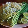 Stalls dot the streets in major cities like Bangkok but the best version of this famous Thai street food I found was in Lumnaria, in Lopburi province. At that stall, the jovial used a large wok to make giant batches for her clamoring fans. She started by combining small strips of chicken, shrimp or other meat with the garlic in the first stage of the stir-fry. This was counter-intuitive, since many cooks fry aromatics alone first. Add chicken, shrimp or other meat to this dish if you wish.<