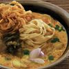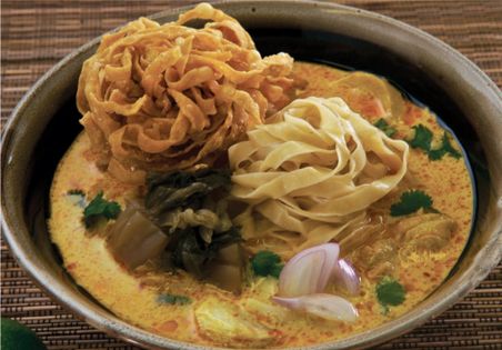 Thai mastery of complex flavors and textures finds its best showcase in this dish of resilient wheat noodles floating in rich scented coconut broth garnished with more crispy noodles. Thailand shares more than just a border with Myanmar (Burma). The nations have borrowed from each other in the evolution of dishes such as Kao Soi. Believed to be a hybrid of the Burmese word “khauk-hswe,” which translates as “noodles,” it also shows influences from Chinese style. A rich, coconut milk-based cu