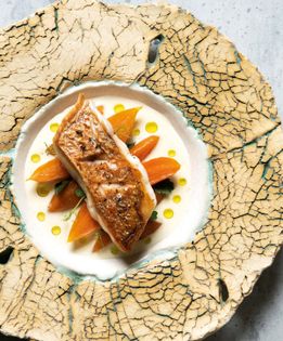This dish is all about the carrot confit and the resulting broth, olive oil flavored with orange and cumin. It would work well with any white mild fish, but I love snapper and I cook it so that its skin is crisp. To do this I score the skin so that the fillet doesn’t buckle in the pan and the skin stays flat against it. I also like to smear a little crème fraîche on the skin. Some people flour it but I like to keep the skin visible and the crème fraîche adds a layer of fat that helps cook t