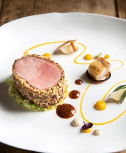 This is a lovely pork dish, a tenderloin briefly brined with cinnamon and star anise, that’s gently cooked, then brushed with a sweet-savory glaze and rolled in nuts and minced guanciale for flavor and crunch. I serve it with Brussels sprouts (also enriched with more guanciale) and a small slab of bacon, since tenderloin is such a lean cut. I love mixing cultures in a dish. I of course became adept at using Asian flavors having worked with Jean-Georges for so long, and the mixture also refl