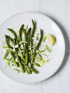 Toss the asparagus in a baking dish in just enough oil to coat. Season with salt and pepper and