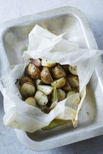 In a bag’, or en papillote’ if you’re feeling fancy, is a classic way of cooking all sorts of ingredients (see the fish and fennel recipe and our other ideas for potatoes overleaf). With new potatoes you end up in a middle ground between roasted and steamed. We serve these all summer in the Field Kitchen, torn open at the table. To make the bag, take a large square of baking parchment and fold it in half Fold three of the sides over firmly two or three tim