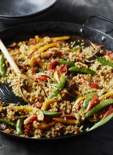 A vegetarian adaptation of the traditional Spanish dish, paella rice is readily available but use short gram brown or Arborio if you can’t jind it. Saffron threads give the dish its unique flavour.