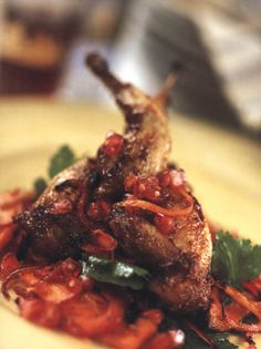 Pomegranate syrup is a sweet-sharp cordial that’s sold in Persian food stores and many Middle Eastern shops. If you can’t get hold of it, use tamarind paste or a light honey (with either of these halve the amount to 1 tablespoon). Quail is a tasty bird that’s fun to eat with your fingers. They are easily roasted by brushing with oil and cooking in an oven at 200°C/400°F/Gas 6 for 12-15 minutes. In this recipe they’re grilled, so flatten them out beforehand as they will then cook a lot quick