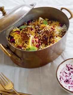 Sindhi biryani is by far the most aromatic and spicy biryani in this book, though the addition of potatoes, sour dried plums and dried pomegranate takes the edge off. This dish should take centre stage on the celebratory dining table, and while the ingredients list is long and it must be cooked with dedication, it’s such a wonderful and worthwhile dish to make for a special occasion. Traditionally the rice and curry is layered twice, but I find that once is enough.