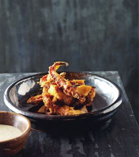 Lauren Murdoch taught this recipe at the Seafood School in a class entitled ‘Bites for Drinks’, and it is a very moreish nibble to serve with pre-dinner drinks or as finger food. The beer batter is light, salty and spicy; you can add more beer, flour, salt or chilli to suit your taste if you like. The octopus braises in its own juices in the oven - the cooking time can vary quite a bit depending on how well i