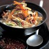 The hand-made wheat noodles are impressive in this dish, although they are remarkably easy to make. The noodles are bathed in a hot chicken broth and topped with julienne vegetables, seasoned chicken shreds and a dash of spicy sauce.