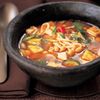Although this rich stew, called doenjang chige, has the same fermented soybean paste foundation as many soups, it is an altogether thicker and heartier casserole. The slow cooking imparts a deep, complex flavour full of spiciness. It is a satisfyingly warm dish, ideal for cold winter evenings, and particularly suits the flavour of flame-grilled meat as an accompaniment.