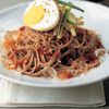 This chilled noodle salad, called bibim naengmyun, is ideal for a summer lunch dish. The cool temperature of the buckwheat noodles contrasts with the spiciness of the dressing, and Asian pear adds a delicious sweetness.
