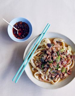 We eat a lot of this super-warming and flavoursome soup at home. In Tibet, it would be made with yak meat and dried pork; Yeshi finds that beef and bacon are the closest he can get outside the region. Smoked ham also makes a good substitute for the dried pork. Although the pork isn’t intentionally smoked in Tibet, it’s hung to dry near the fire, where it naturally absorbs the flavour, becoming blackened from the